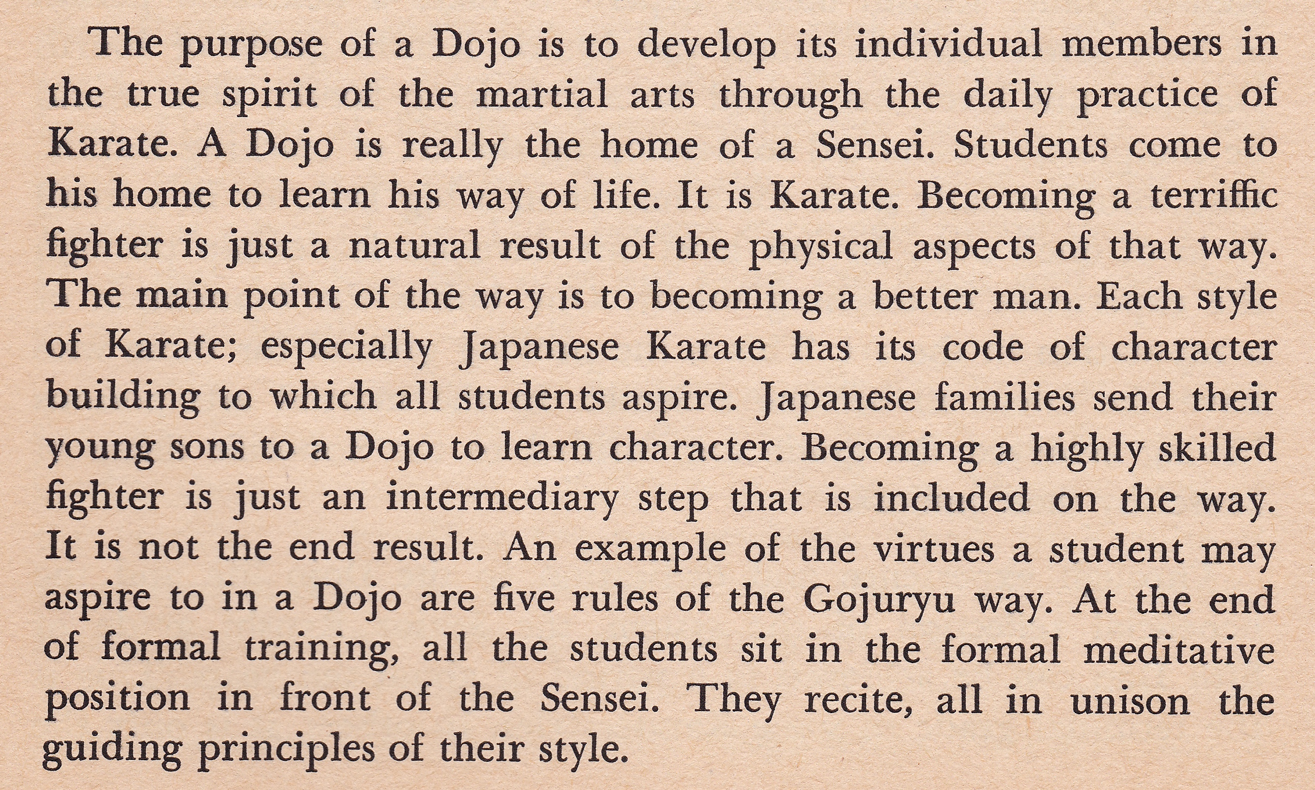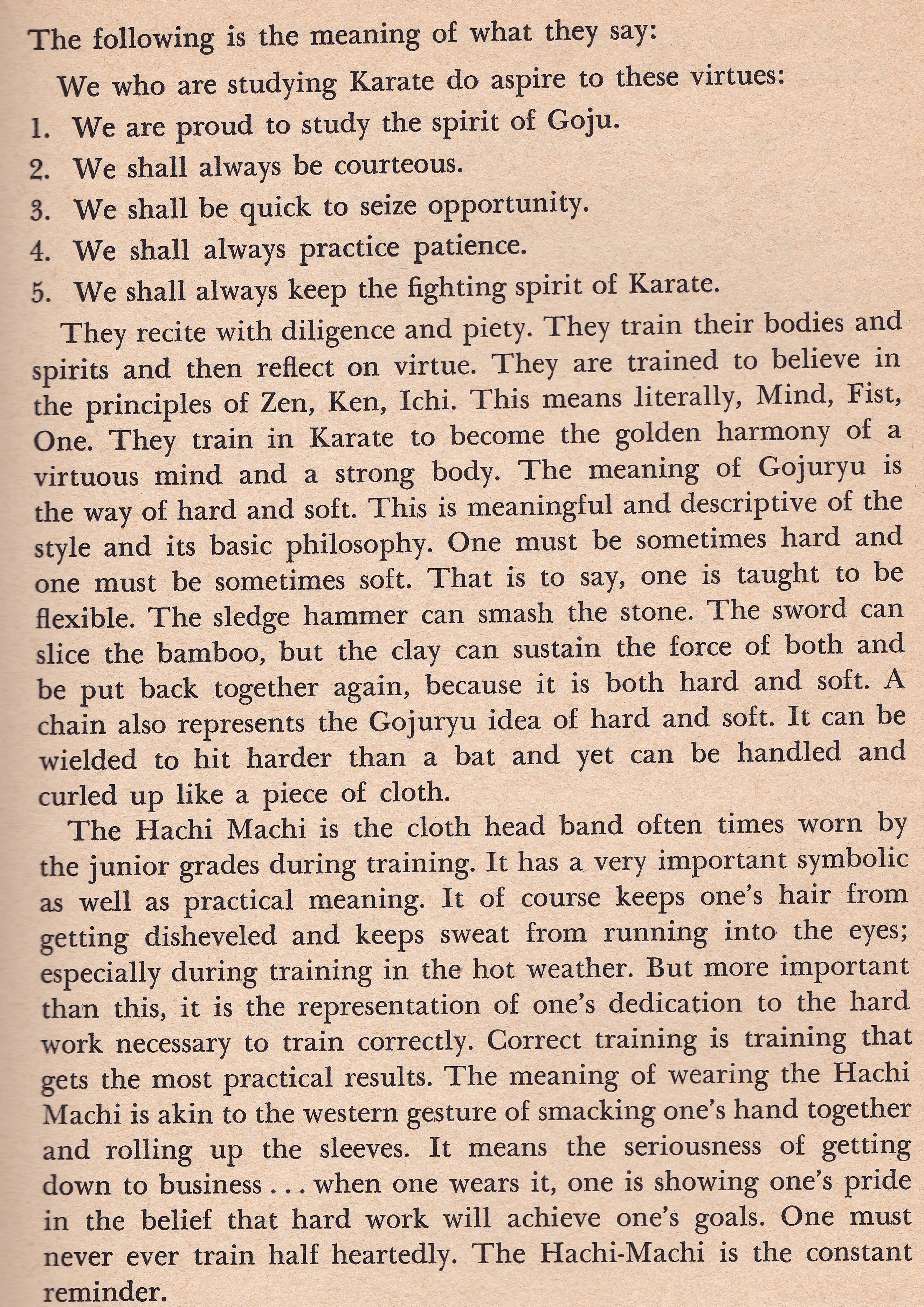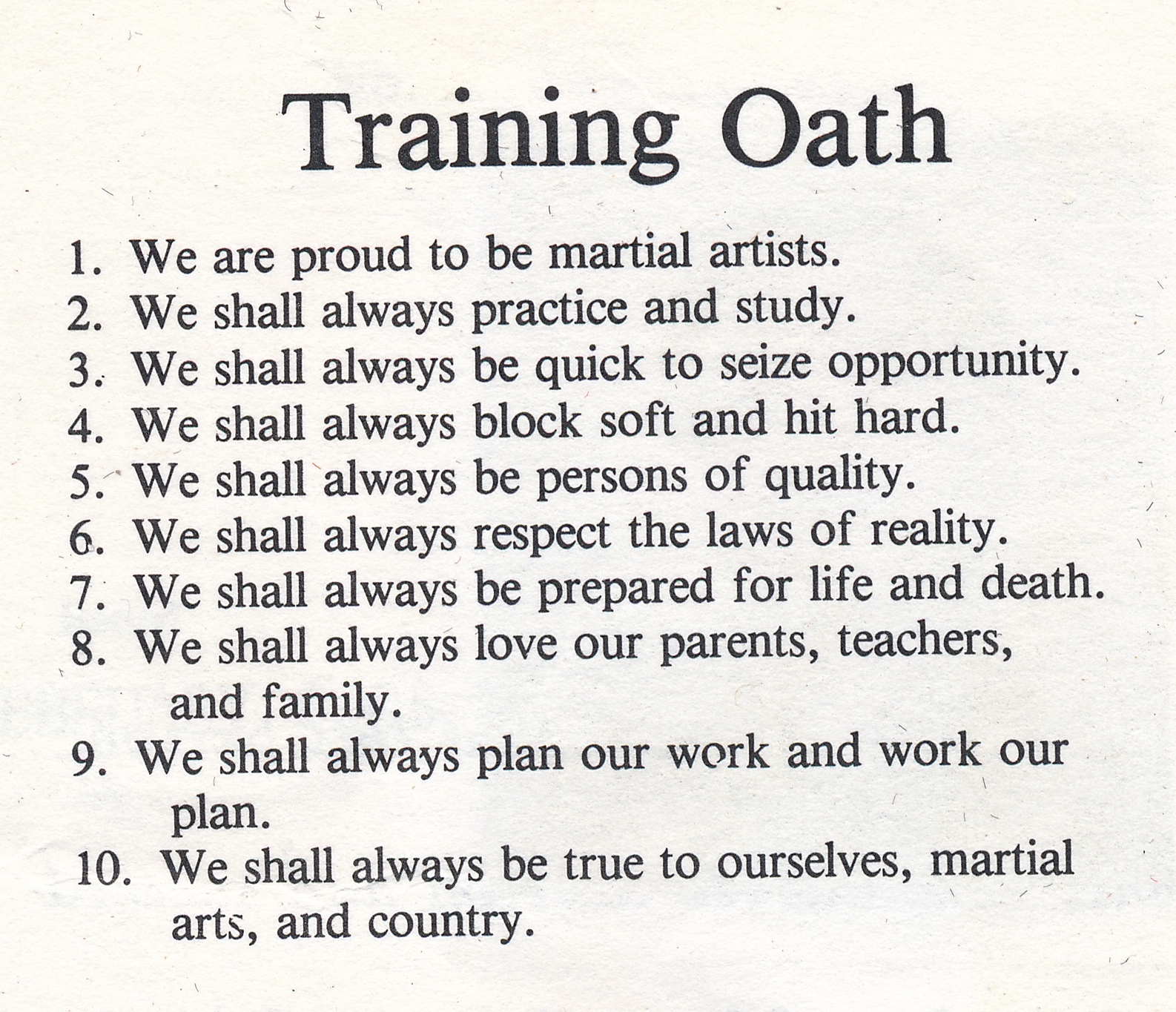 The Training Oath was something that was used throughout many systems and was said out of the Zen position at the conclusion of every class. These were the two that were used by Sensei Urban. The latter of the two numbering 10 was used in from the 1970s forward. It always had to do with Encouragement and Character!!! It has since been dropped by most because the greatest number of trainees today are children! The first two excerpts are from the Yellow Cover “The Karate Dojo”.