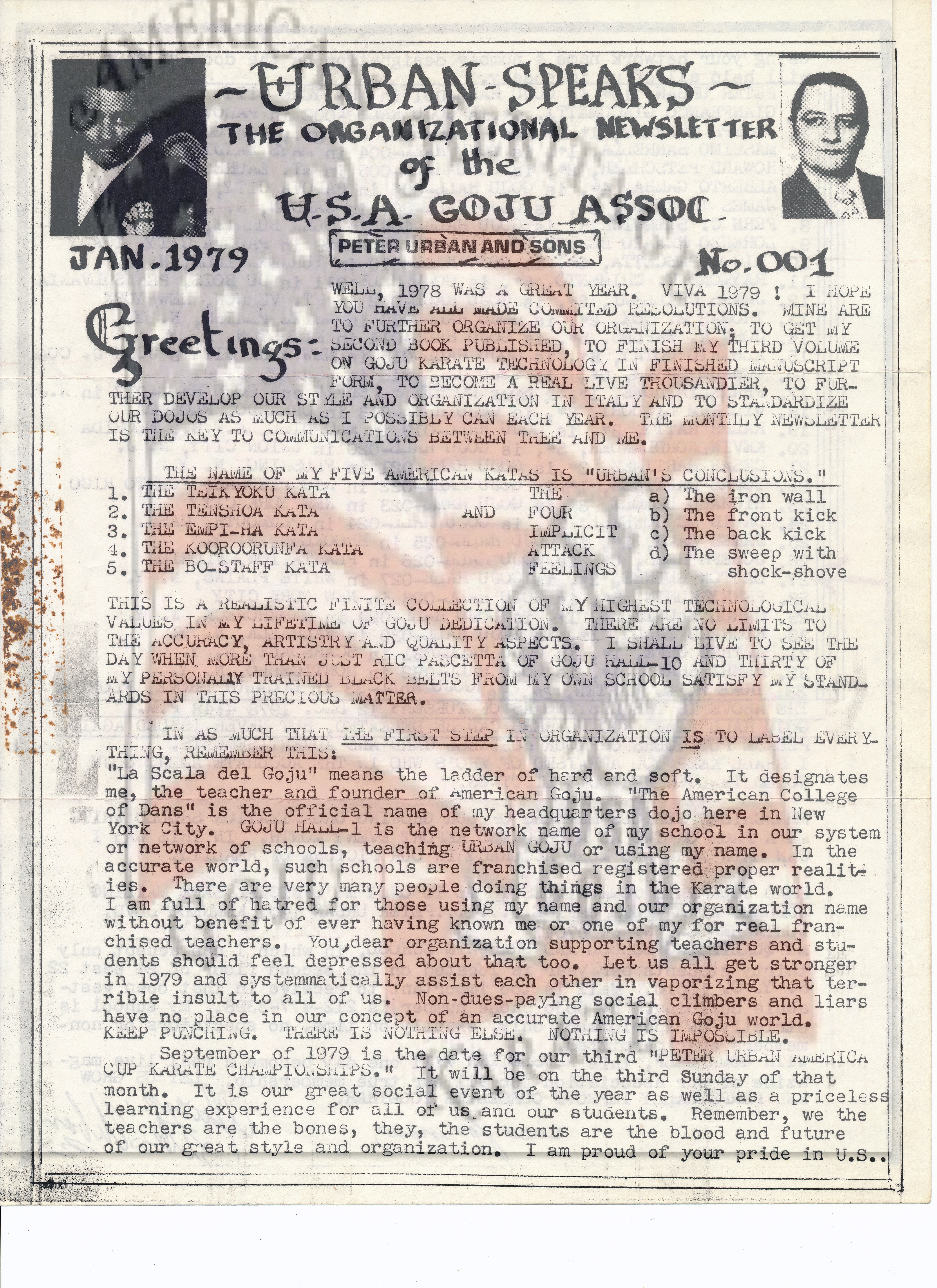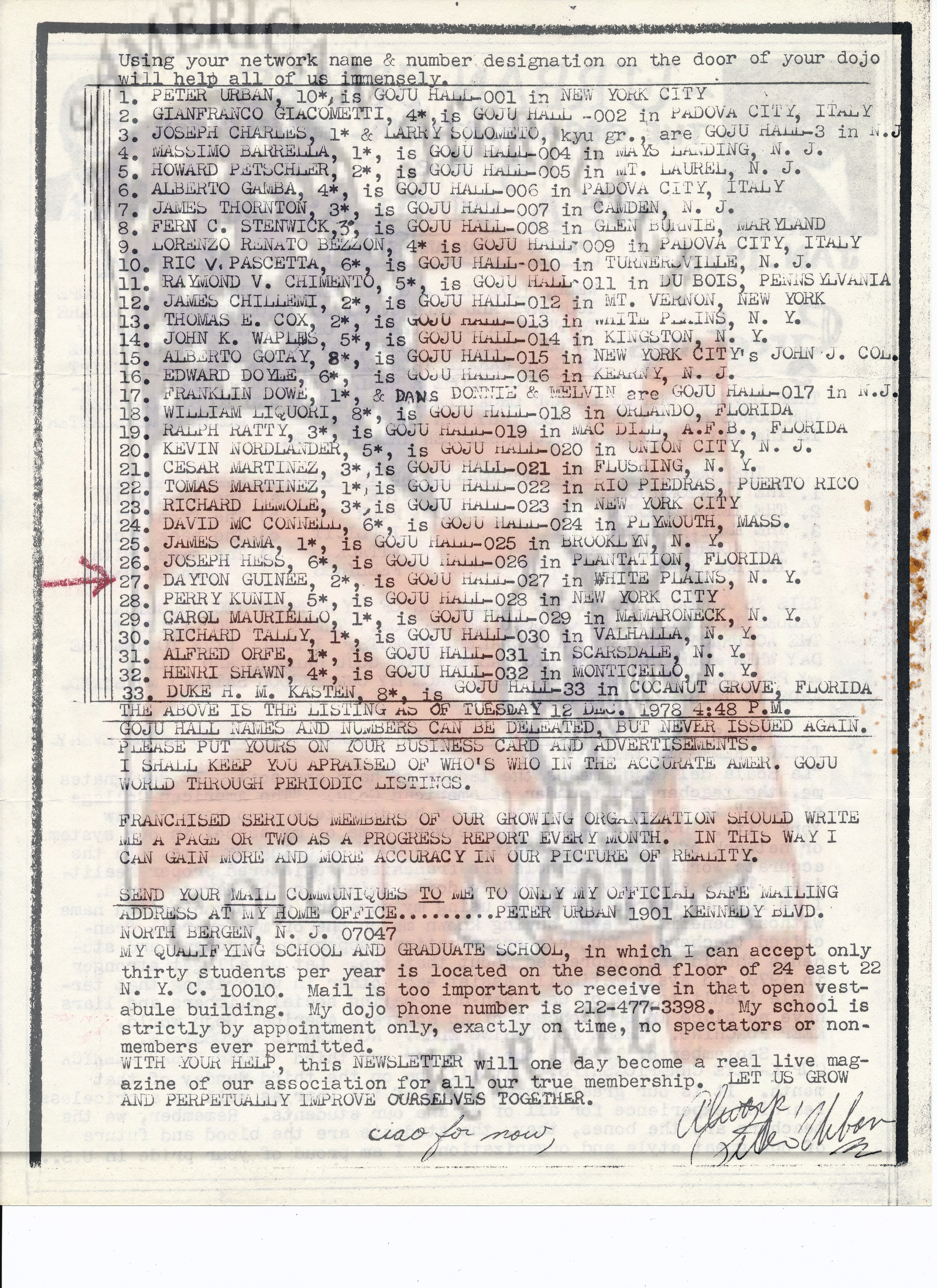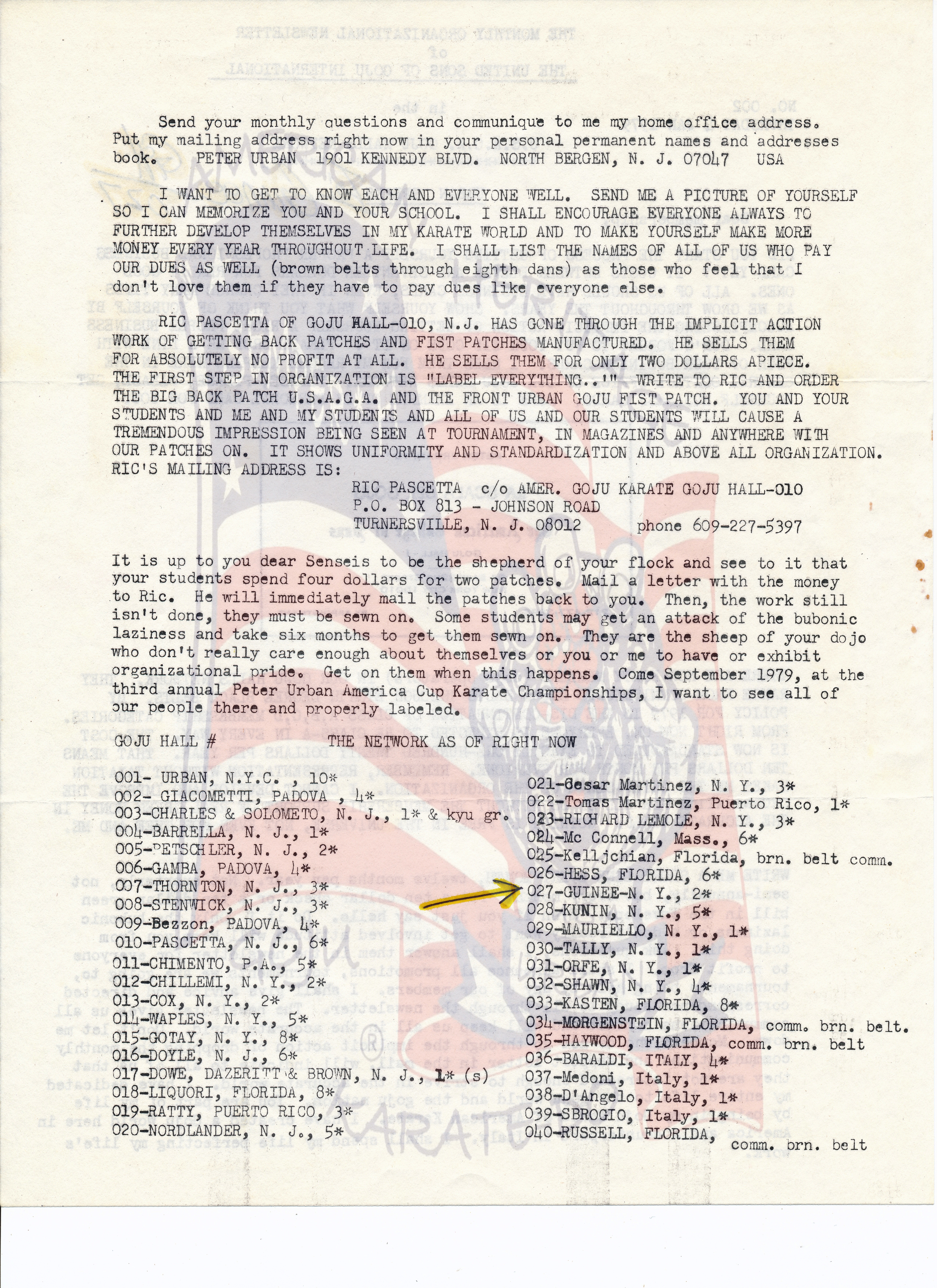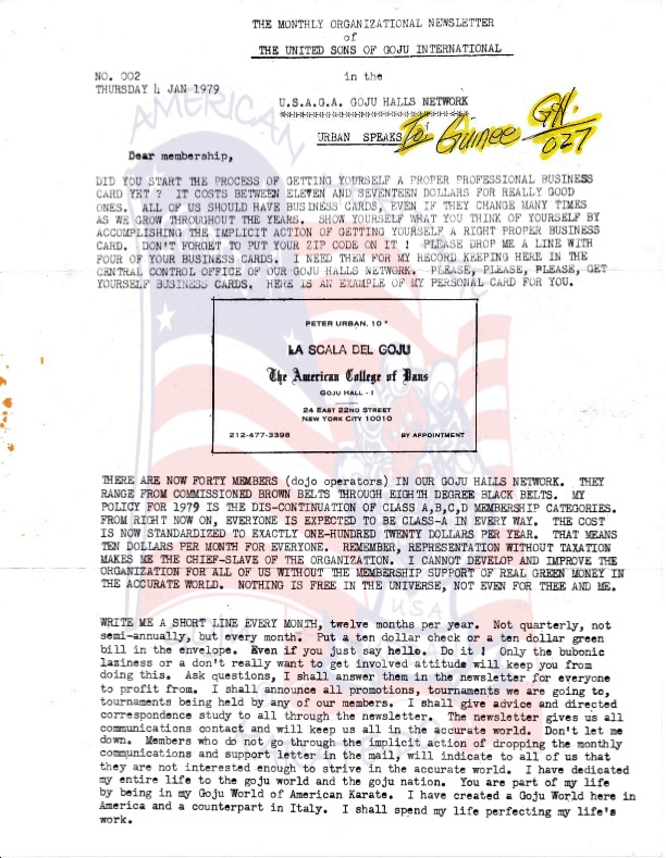In this news letter Sensei Urban talks about organization and who the dues payers are. This is consistent in all of his news letters. He speaks about having the organization staying strong and organized as far as labeling is concerned so everyone has the correct insignias for representation. He also speaks about our established group here in the USA and in Italy. If you look at his list of members it shows all who are dues paying members. Lots of his members did not pay dues as they should but it did not stop them from wearing our uniform or insignias. That would go on for his entire career. In fact more people wear it now even though they stopped paying dues years ago. As we go on, you will see that Sensei was blind sided by who everyone thought was one of his most loyal students. This is not to show anything negative or positive, but to tell the truth about our history. However, what took place going forward was wrong by many. If you look at the organization today you will see people struggling with who was or is the leader of USA GOJU. Isn’t it strange that none of these individuals will be found on most all of Sensei Urban’s membership lists. They may show you a certificate but you won’t see their name as I said on any of his membership lists.